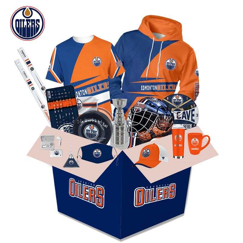 What's in the box During the festival, a limited number of Edmonton Oilers-related products will be sent randomly. Including hoodie, Billiard Light, Mini Composite Hockey Stick, cups, headphones, Goalie Mask, Game Puck, AirPods case, iPhone case, puzzles, hats, 15'' Neon Clock, and other products. (The box is worth more than $100). All items are sent as gifts related to Edmonton Oilers.