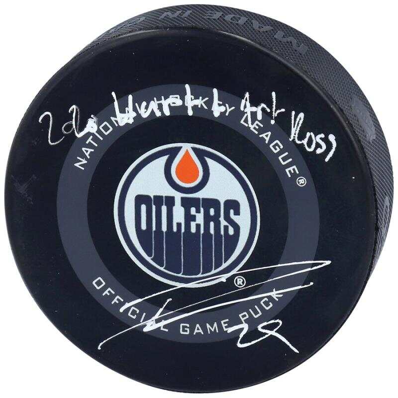 Autographed Edmonton Oilers Leon Draisaitl 2019 Model Game Puck with "2020 Hart + Art Ross" Inscription