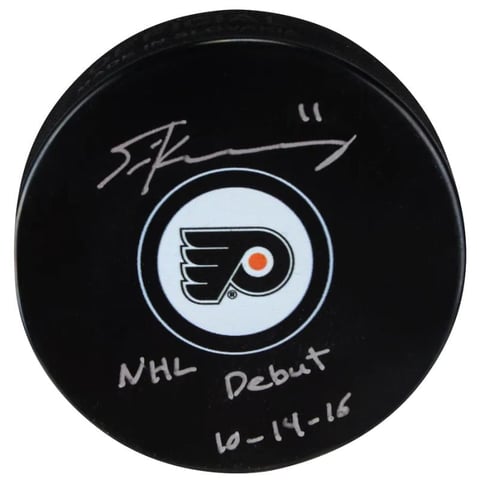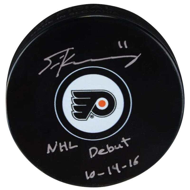 Autographed Philadelphia Flyers Travis Konecny Hockey Puck with "Debut 10/14/16" Inscription