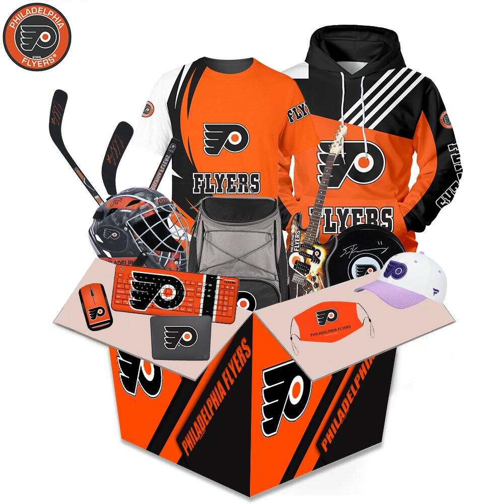 What's in the box During the festival, a limited number of Philadelphia Flyers-related products will be sent randomly. Including hoodie, Billiard Light, Mini Composite Hockey Stick, cups, headphones, Goalie Mask, Game Puck, AirPods case, iPhone case, puzzles, hats, 15'' Neon Clock, and other products. (The box is worth more than $100). All items are sent as gifts related to Philadelphia Flyers.